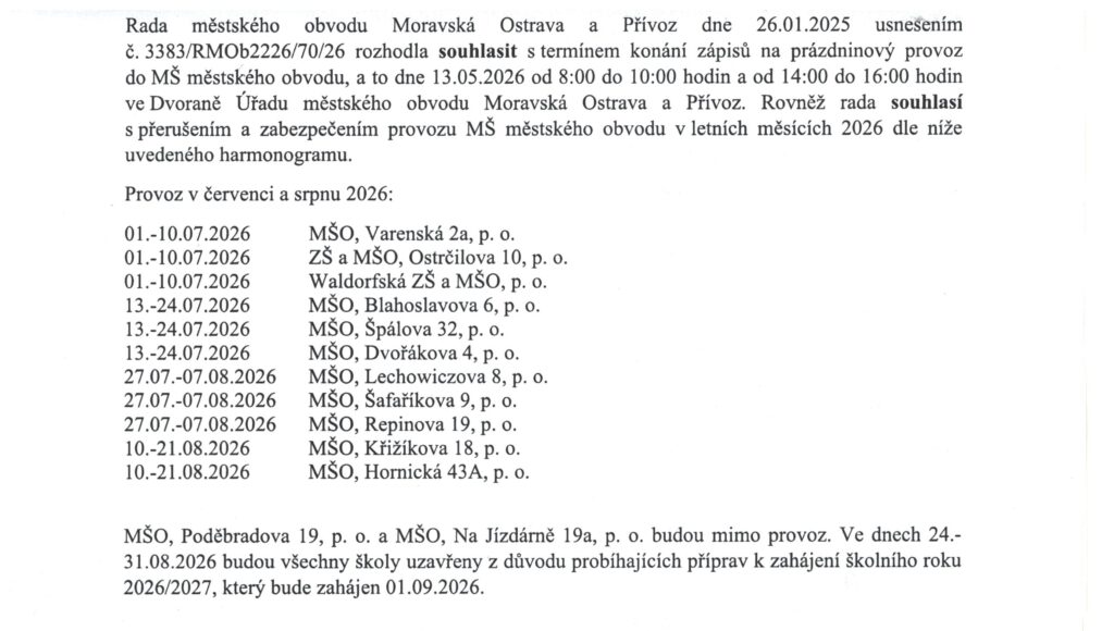Zápis na prázdninový provoz proběhne pro všechny MŠ dne 13. 5. 2026 ve Dvoraně na radnici Úřadu městského obvodu Moravská Ostrava a Přívoz (náměstí Dr. E. Beneše 555/6, 729 29 Ostrava) v časech od 8:00 do 10:00 hodin a od 14:00 do 16:00 hodin.